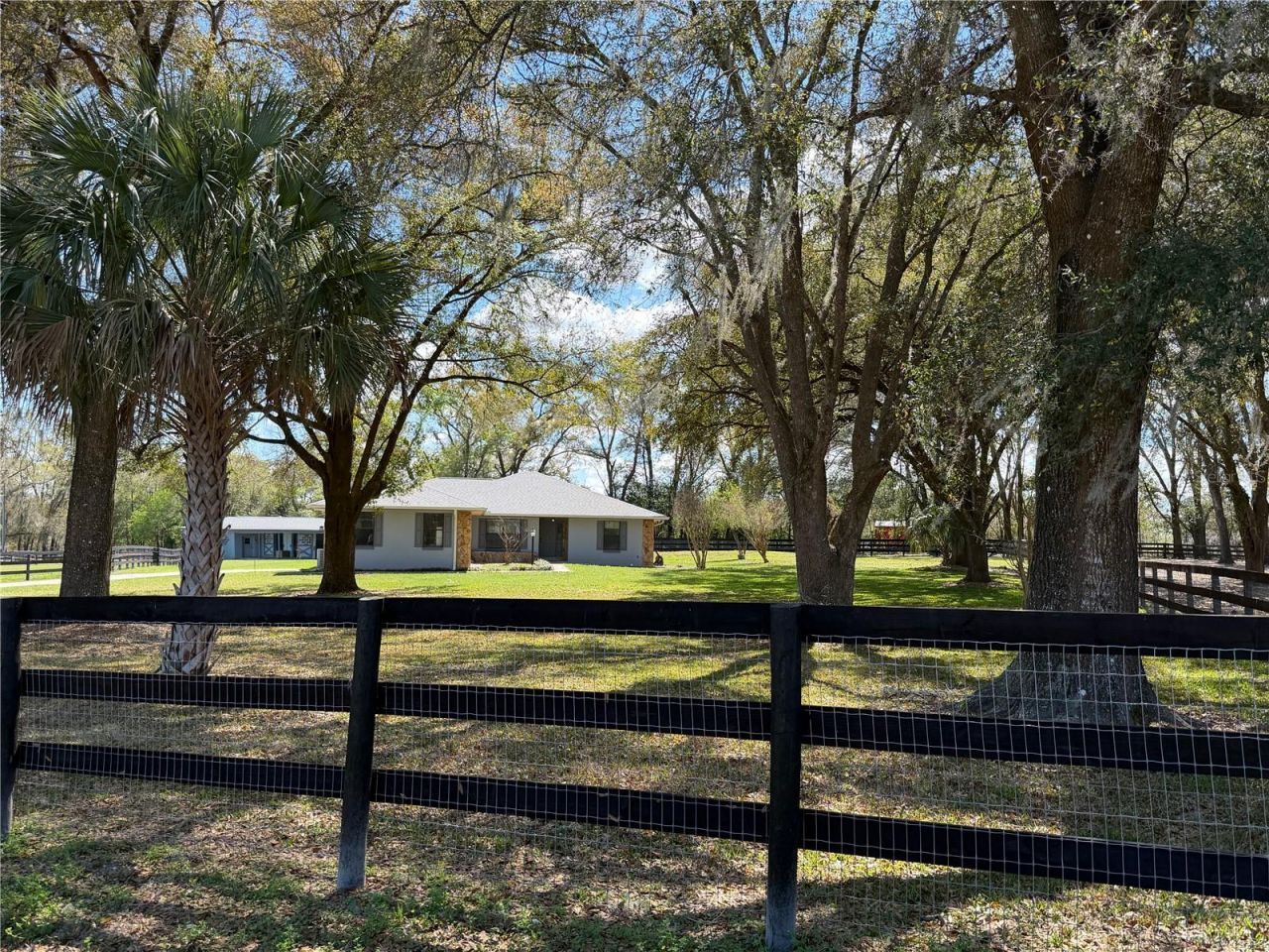Nestled within the equestrian neighborhood of Meadow Wood Farms, this well-equipped mini-farm provides a comfortable lifestyle within Ocala's vibrant Horse Country. Fenced and gated on a large 3.70 acre lot, the farm is nicely private with plenty of shade from mature trees. The 3-bedroom, 2-bath pool home offers 1,875 square feet of living space with vaulted ceilings, good natural light, and ceramic tile and luxury vinyl flooring throughout. The main living area provides space for both living and dining, making it easy to accommodate everyday living or gatherings. The kitchen includes ample cabinet and counter space, a pass-through window to the living area, and a breakfast nook with a bay window. Both bathrooms have been tastefully updated with new vanities, mirrors, and fixtures. The primary suite features a large walk-in closet and a private bath with dual sinks and a walk-in shower. At the back of the home is a flex room overlooking the pool, which could work well as a second living area, office, or hobby space. Outside, the screen-enclosed pool area includes an in-ground pool, spacious pool deck, and a covered seating area with ceiling fans and a TV mount, with views of the surrounding farm. Additional features include a 2-car attached garage and a laundry room with utility sink and storage.Designed with horses in mind, the farm features a 3-stall block shed-row style barn, complete with tack room and wash rack. Three paddocks are in place with board fencing and no-climb, allowing for plenty of space for turnout and training. Located just a short drive from HITS and less than 10 minutes to WEC, this property is an ideal option to take advantage of Ocala's diverse and well-supported network of equine retailers, service providers, veterinary care, and show/competition venues. If you've been searching for a manageable farm with plenty of flexibility, look no further!