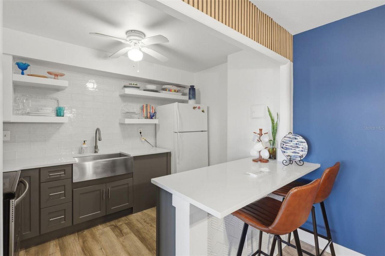 Move-in ready and beautifully updated, this inviting condo offers comfort, style, and smart use of space. Enjoy a welcoming entry area, a stunning tuxedo kitchen with soft-close cabinets, deep farm sink, open shelving, glass tile backsplash, and island pantry storage. Luxury vinyl plank flooring, tall baseboards, modern lighting, ceiling fans, and a designer focal wall create a fresh, upscale feel. A defined office space adds flexibility, and the huge enclosed patio expands your living area. The large bedroom easily fits a king bed and dresser. Low $628/month HOA covers everything except electricity. 2023 air handler and 2013 windows and slider add peace of mind.
