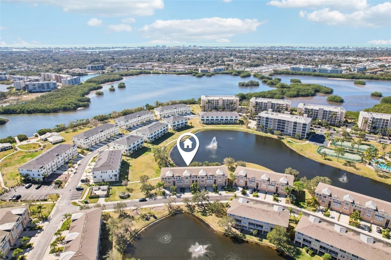 One or more photo(s) has been virtually staged. Experience maintenance-free waterfront living at its finest in this stunning 3-bedroom, 2.5-bathroom townhome in the gated community of Seminole Isle. The main level welcomes you with a bright, open-concept living area and a gourmet kitchen featuring a center island, ample storage, and a convenient built-in desk. A flexible den space provides the perfect footprint for a home office or additional living area. The living room opens to a screened balcony overlooking the serene lake, equipped with remote-controlled accordion shutters for peace of mind. For ultimate convenience, a half-bath and laundry room are also located on the main floor. Upstairs, the functional layout continues with a spacious loft featuring a second built-in desk. The primary suite is a true retreat, offering a large walk-in closet and an ensuite bathroom with dual separate vanities, a soaking tub, and a standalone shower. Two additional guest bedrooms share a full bath. On the ground level, enjoy a private lanai located off the 2-car garage. Your HOA fee covers cable, internet, and water, while world-class amenities include a clubhouse, fitness center, resort-style pool, and tennis courts. Ideally located near beaches, shopping, and Lake Seminole Park, this home perfectly balances luxury and location. Schedule your private showing today and start living the Florida dream!