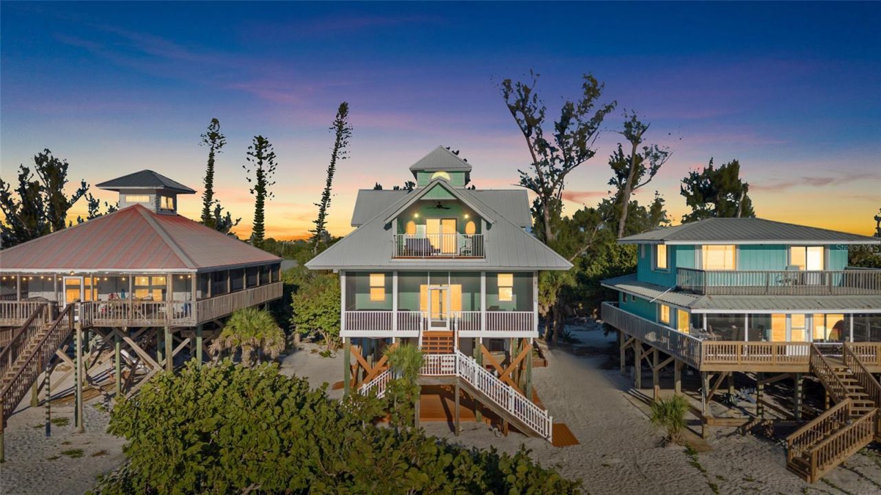 This beautiful gulf front home, located on Little Gasparilla Island, features a custom coastal design, with stunning views and a relaxing atmosphere. Little Gasparilla Island, a bridgeless barrier island off the Cape Haze peninsula, is accessible only by private boat or water taxi only. LGI has a peaceful and friendly atmosphere, with no shops, restaurants, or car traffic. Residents enjoy sandy trails, and lush tropical foliage. Every detail of this home has been carefully considered, creating a lovely living space that combines comfort and style. The metal roof, Hardie board siding and trim, Hardie soffit, and Hardie ceiling in the lanai were installed in 2023, along with impact windows and doors installed throughout the home, ensuring durability and safety. A full list of updated features is available upon request. On the first floor, you'll find a guest bathroom and bedroom, a laundry room, a kitchen, a living room, a dining room, and a large screened-in lanai. The kitchen is thoughtfully designed for those who love to cook and entertain, flowing seamlessly into the dining and living areas. The new windows and sliding glass door offer breathtaking views of the gulf and allow plenty of natural light to fill the space. During spring and fall, opening the windows and doors invites refreshing tropical breezes throughout the home. The spacious screened-in front lanai and the master bedroom balcony are perfect spots to sip your morning coffee or simply relax while watching dolphins and manatees swim by during the day. In the evening, you can enjoy spectacular sunsets over the gulf. On the second floor, the primary bedroom boasts two walk-in closets and an en-suite bathroom with a tub/shower combo, and a walk-in shower, and a double vanity. Each morning starts with a breathtaking view of the water from your bed. The second bedroom, also on the second floor, includes two rooms that make the most of the roof design, serving as storage space and an additional sleeping area. The home is equipped with two central vacuum units, one upstairs and one downstairs. Beneath the home is a storage area for keeping a golf cart, tools, fishing tackle, and beach toys. You can enjoy walking the beautiful 3 1/2 miles of beach in search of perfect shells and shark's teeth, or fishing for redfish, snook, snapper, and more in the surrounding waters. This well-kept beachfront home offers a unique opportunity to enjoy the coastal lifestyle. Once you visit and experience its charm and comfort, you'll never want to leave.