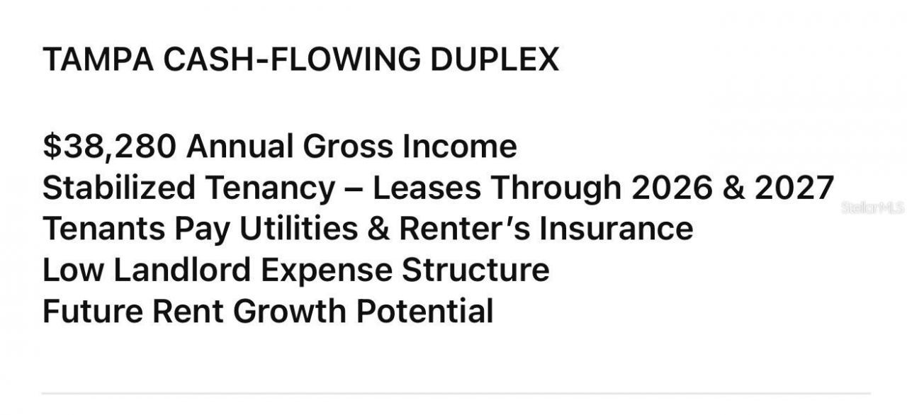 TAMPA CASH-FLOWING DUPLEX INVESTMENT WITH LOW LANDLORD EXPENSE STRUCTURE. Property features quality tenants with long term leases in place, tenant paid utilities, low maintenance structure, strong Tampa rental demand. -INCOME CERTAINTY with this Tampa Duplex Property producing $38,280 in annual gross rental income. -STABILITY with leases secured through July 2026 and March 2027. -UPSIDE OPPORTUNITY with tenants paying utilities and renter's insurance.
