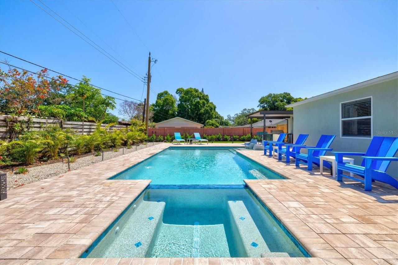 Welcome to the Ringling Retreat, a luxurious family compound in the heart of downtown Sarasota. The property sits just a few blocks from the East end of Main Street downtown and is perfectly walkable to the Legacy Trail, Payne Park, & a number of shops & restaurants. A screened entryway in the front greets you before stepping through the front door into a light and bright living area with views out to the new heated pool & generous seating including a queen sleeper sofa & two club chairs. A 65 inch mounted tv in this room w/ complimentary streaming services is accessible from the living room as well as the 3 stools at the breakfast bar separating the living space from the designer kitchen. The kitchen offers SS appliances & European style cabinets that are all labeled for your convenience & offer soft close hardware. Adjacent to the kitchen is a large dining area with seating for up to 12. The main house offers 3 large bedrooms & 2 well appointed bathrooms. The bed configuration is as follows: Bedroom 1 is just off the living room and is separated by french doors with privacy curtains. This room offers sleeping for up to 4 guests w/ two stand alone twin beds as well a twin over twin bunk bed. An open shelf closet, nightstand and mounted tv complete the set up. Bedroom 2 is located on the Master wing of the house with good separation from the Master bedroom and with easy access to the guest bathroom. This room offers a queen bed with two nightstands, a dresser and a large reach in closet. A large flat screen tv sits on top of the dresser. The Master bedroom is huge and offers a king bed with two nightstands, a dresser and a mounted tv on one of two shiplap accent walls. The Master has a zen feel and offers a large walk in closet, separate water closet/toilet area, and a recently remodeled spa-like bathroom with tiled shower, and double vanity sinks. Access to the courtyard & pool area is available from the Master. Step beyond the kitchen & dining area to an exterior covered breezeway to find a laundry closet to the right as well as a beach essentials closet to the left. The keypad enabled door between both closets grants access to the guest house which features a full living room w/ two large sofas including a queen pullout sleeper sofa as well as two club chairs. Adjacent to the living area is a full kitchen & eat-in kitchen area as well as a 2nd washer & dryer. Beyond the living space is a large bedroom w/ King bed, 2 night stands & mounted flat screen. This 2nd Master offers a walk in closet & full en suite bathroom. Beyond the breezeway & into the courtyard you'll find a large glistening pebble tec heated saltwater pool w/ an in-ground heated spa and large sun shelf that allows you to stay dry with your toes in the water. Two in-pool club chairs offer cupholders for your cold beverages as you soak up the Sarasota sunshine. Need some shade? We installed a Miami Dade hurricane rated patio with covered roof and an outdoor kitchen and bar area offering ample counter space and cabinetry, a mini fridge, and a premium 40 propane grill. 4 stools face the mounted TV so you can watch the game while your loved ones play nearby. Outdoor dining can be had either at the outdoor kitchen bar or the dining table with seating for 8 under a teal Sunbrella. On the far side of the pool you'll find a gorgeous putting area for golf enthusiasts and children alike. New landscaping and landscape lighting make this feel like a resort at night.
